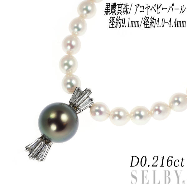 Pt900/ K14WG 黒蝶/アコヤベビーパール ダイヤモンド ペンダントネックレス 径約9.1mm 径約4.0-4.4mm D0.216ct