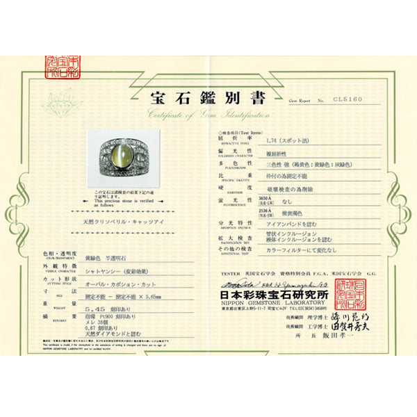 | Pt900 クリソベリルキャッツアイ ダイヤモンド リング 5.45ct D0.87ct | |