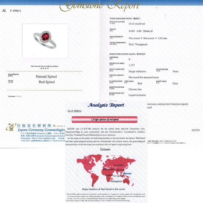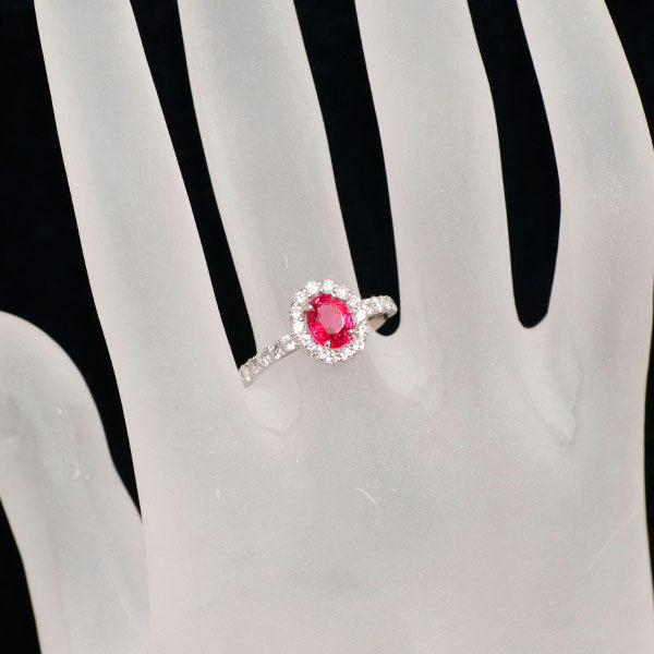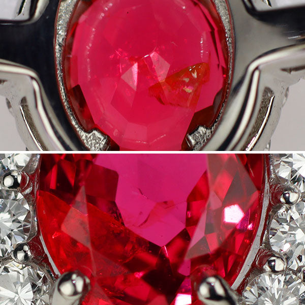 | 新品 Pt950 強蛍光 ベトナム産レッドスピネル ダイヤモンド リング 0.945 D0.49ct【エスコレ】 | |